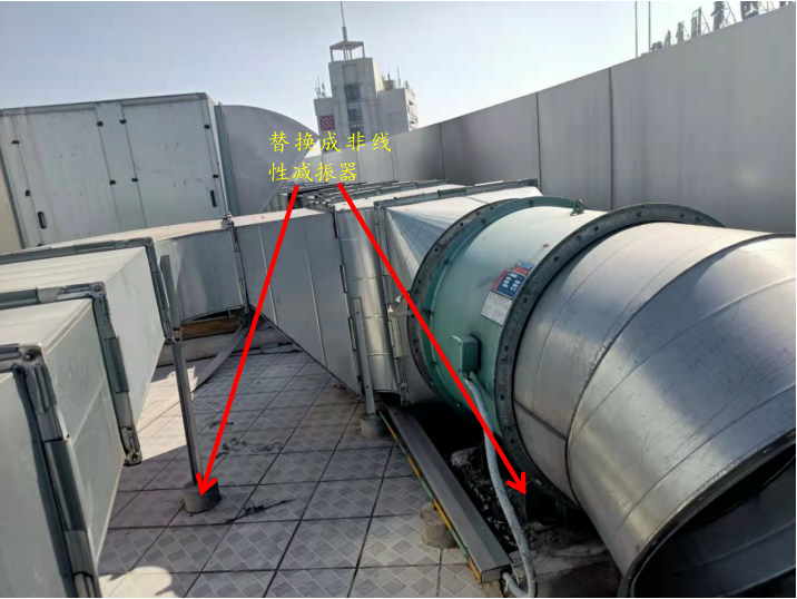 由于風機位于敏感點正上方,設備運行時產生的振動會通過樓板傳播到樓下房間,振動會在室內產生共振,影響到室內的聲環境。因此需要將原有的鋼結構落地支撐換成更換成非線性減振器,以應對不同頻率下的振動噪聲。